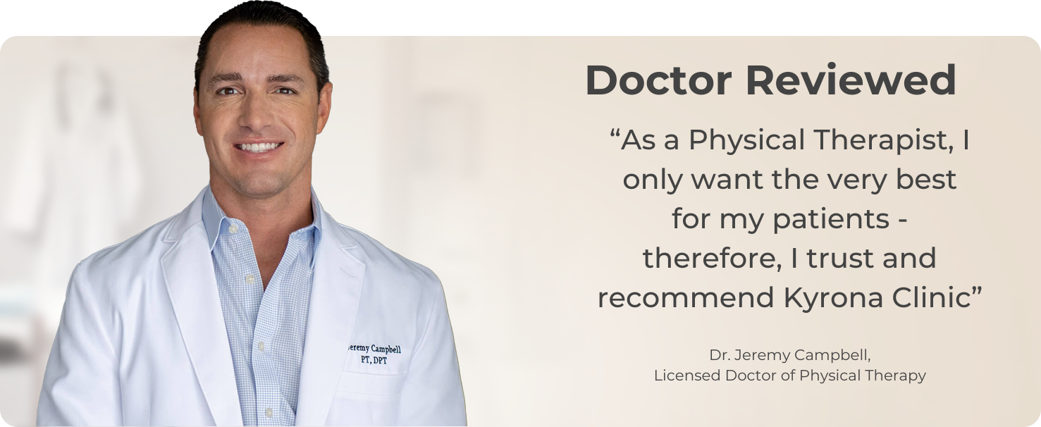 Dr. Jeremy Campbell: Doctor of Physical Therapy, Therapeutic Pain Specialist, Medical Innovator, Educator, and the mind behind the science of Kyrona Clinic. Treated thousands of patients over ten years in outpatient orthopedic physical therapy in Chicago. Specialized in pain management through years of experience, trainings, and certifications. Expert in strengthening and conditioning of the human body. For over ten years, he has been one of the top experts in orthopedic physical therapy. His experiences took him to new frontiers of medical and movement science. He is now a driving force behind medical technology and treatments – breakthroughs revolutionizing the way patients are treated.